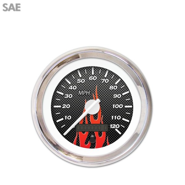 Product :: Speedometer Style :: Carbon Fiber Series ~ Red Flame Unit Of Measure :: Imperial Trim Ring Series :: Modern Trim Ring Color :: Chrome Needle Series :: Modern Needle Color :: White Emblem :: None | Assembly :: Gauge with Face Uninstalled Speedometer Range :: 0 - 120 mph Interchangeable Faces :: Yes Interchangeable Needles :: Yes Interchangeable Trim Ring :: Yes Gauge ID :: 2.25'' (56.8mm) Gauge OD :: 3.37'' (85.7mm) Odometer :: Included | Odometer Units :: Imperial & Metric Speedo Sensor :: GM Motor Style :: Stepper Motor Accuracy :: Industry Leading Accuracy Designed Location :: USA Support :: Toll Free Tech Support |