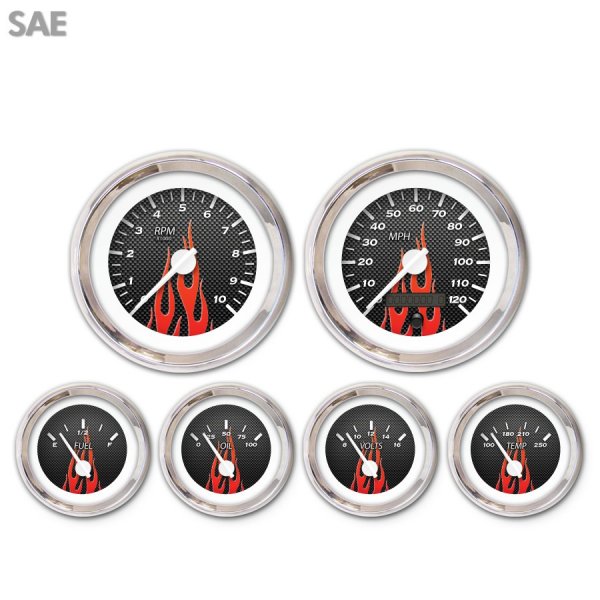 Product :: 6 Gauge Set Style :: Carbon Fiber Series ~ Red Flame Unit Of Measure :: Imperial Speedometer Gauge :: Included Tachometer Gauge :: Included Fuel Level Gauge :: Included Oil Pressure Gauge :: Included Volt Gauge :: Included Water Temp Gauge :: Included Trim Ring Series :: Modern Trim Ring Color :: Chrome Needle Series :: Modern Needle Color :: White Emblem :: None | Assembly :: Gauge with Face Uninstalled Speedometer Range :: 0 - 120 mph Tachometer Range :: 0 - 10,000 rpm Fuel Level Range :: Empty - Full Oil Pressure Range :: 0 - 100 psi Volt Range :: 8 - 16 volt Water Temp Range :: 100 - 250 f Interchangeable Faces :: Yes Interchangeable Needles :: Yes Interchangeable Trim Ring :: Yes Number of Gauges :: 6 Number of Large Gauges :: 2 Number of Small Gauges :: 4 Large Gauge ID :: 2.25'' (56.8mm) | Small Gauge ID :: 1.8'' (47mm) Large Gauge OD :: 3.37'' (85.7mm) Small Gauge OD :: 2.06'' (56.4mm) Speedo Sensor :: GM Fuel Sensor :: Included Programable Fuel Sensor :: Yes Pressure Sensor :: Included Temp Sensor :: Included Tachometer Cylinders :: Adjustable ~ Up to 12 Motor Style :: Stepper Motor Accuracy :: Industry Leading Accuracy Designed Location :: USA Support :: Toll Free Tech Support |