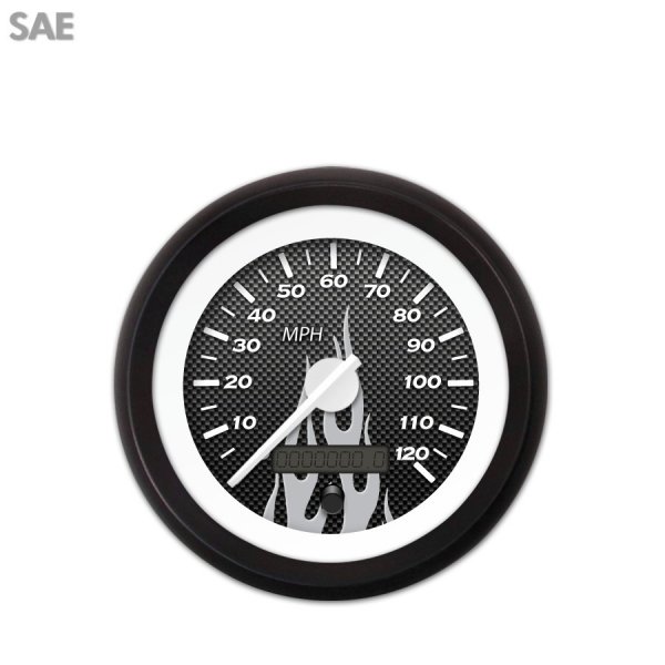 Speedometer Gauge - SAE Carbon Fiber Gray Flame, White Modern Needles, Black Trim Rings ~ Style Kit DIY Install