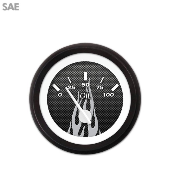 Oil Pressure Gauge - SAE Carbon Fiber Gray Flame, White Modern Needles, Black Trim Rings ~ Style Kit DIY Install