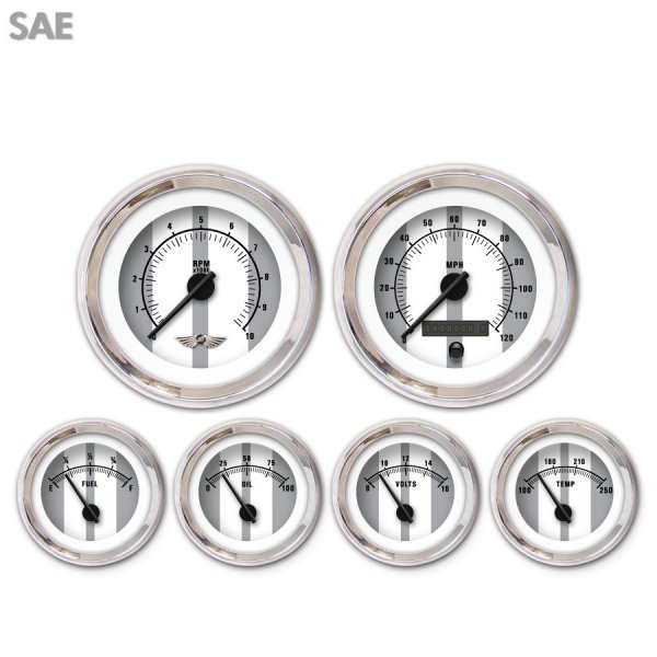 Aurora 6with emblem -Gauge Sets use the latest technology to allow you to monitor your vehicle in style. Aurora 6with emblem -Gauge Kits include tachometer, speedometer, oil pressure gauge, water temperature gauge, fuel level gauge, and a volt gauge. Aurora gauges are available in Metric and Imperial units of measure, making them ideal for all applications around the world. Advanced LED illumination allows for precise, even lighting levels on the gauge face while reducing glare. All aurora gauges include interchangeable trim rings, needles, and gauge faces with emblem - allowing you to change the look of your gauges before or after installation. Includes sensors and backed by a Limited Lifetime Warranty.