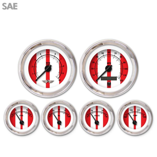 6 Gauge Set with emblem - SAE Cobra Red , Black Modern Needles, Chrome Trim Rings ~ Style Kit DIY Install