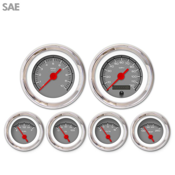 6 Gauge Set - SAE Competition Grey , Red Vintage Needles, Chrome Trim Rings ~ Style Kit DIY Install