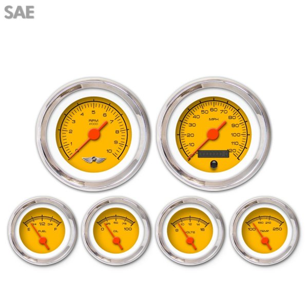 6 Gauge Set with emblem - SAE Competition Yellow , Orange Vintage Needles, Chrome Trim Rings ~ Style Kit DIY Install