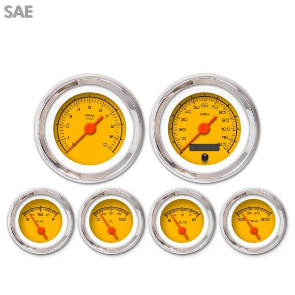 6 Gauge Set - SAE Competition Yellow , Orange Vintage Needles, Chrome Trim Rings ~ Style Kit DIY Install