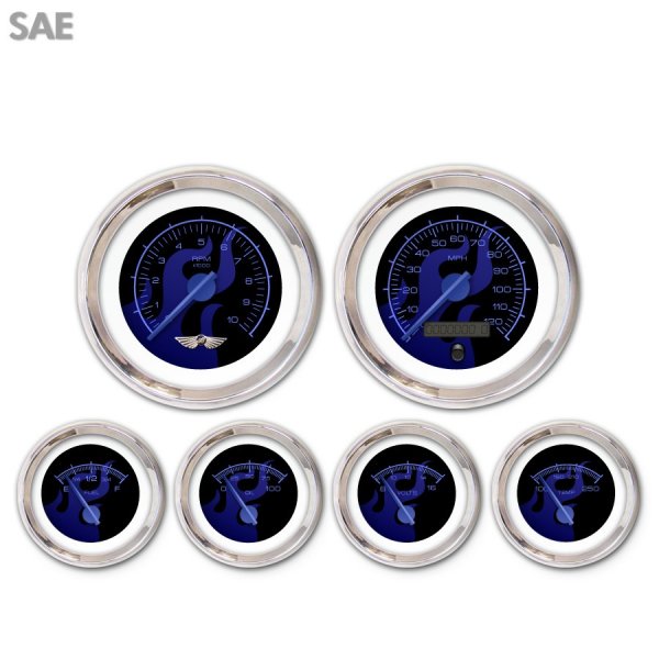 Product :: 6 Gauge Set Style :: Ghost Flame Series ~ Black Blue Flame Unit Of Measure :: Imperial Speedometer Gauge :: Included Tachometer Gauge :: Included Fuel Level Gauge :: Included Oil Pressure Gauge :: Included Volt Gauge :: Included Water Temp Gauge :: Included Trim Ring Series :: Modern Trim Ring Color :: Chrome Needle Series :: Modern Needle Color :: Blue Emblem :: Wing | Assembly :: Gauge with Face Uninstalled Speedometer Range :: 0 - 120 mph Tachometer Range :: 0 - 10,000 rpm Fuel Level Range :: Empty - Full Oil Pressure Range :: 0 - 100 psi Volt Range :: 8 - 16 volt Water Temp Range :: 100 - 250 f Interchangeable Faces :: Yes Interchangeable Needles :: Yes Interchangeable Trim Ring :: Yes Number of Gauges :: 6 Number of Large Gauges :: 2 Number of Small Gauges :: 4 Large Gauge ID :: 2.25'' (56.8mm) | Small Gauge ID :: 1.8'' (47mm) Large Gauge OD :: 3.37'' (85.7mm) Small Gauge OD :: 2.06'' (56.4mm) Speedo Sensor :: GM Fuel Sensor :: Included Programable Fuel Sensor :: Yes Pressure Sensor :: Included Temp Sensor :: Included Tachometer Cylinders :: Adjustable ~ Up to 12 Motor Style :: Stepper Motor Accuracy :: Industry Leading Accuracy Designed Location :: USA Support :: Toll Free Tech Support |