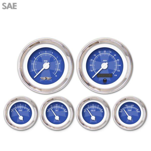 Product :: 6 Gauge Set Style :: Iron Cross Series ~ Blue Unit Of Measure :: Imperial Speedometer Gauge :: Included Tachometer Gauge :: Included Fuel Level Gauge :: Included Oil Pressure Gauge :: Included Volt Gauge :: Included Water Temp Gauge :: Included Trim Ring Series :: Modern Trim Ring Color :: Chrome Needle Series :: Modern Needle Color :: White Emblem :: Wing | Assembly :: Gauge with Face Uninstalled Speedometer Range :: 0 - 120 mph Tachometer Range :: 0 - 10,000 rpm Fuel Level Range :: Empty - Full Oil Pressure Range :: 0 - 100 psi Volt Range :: 8 - 16 volt Water Temp Range :: 100 - 250 f Interchangeable Faces :: Yes Interchangeable Needles :: Yes Interchangeable Trim Ring :: Yes Number of Gauges :: 6 Number of Large Gauges :: 2 Number of Small Gauges :: 4 Large Gauge ID :: 2.25'' (56.8mm) | Small Gauge ID :: 1.8'' (47mm) Large Gauge OD :: 3.37'' (85.7mm) Small Gauge OD :: 2.06'' (56.4mm) Speedo Sensor :: GM Fuel Sensor :: Included Programable Fuel Sensor :: Yes Pressure Sensor :: Included Temp Sensor :: Included Tachometer Cylinders :: Adjustable ~ Up to 12 Motor Style :: Stepper Motor Accuracy :: Industry Leading Accuracy Designed Location :: USA Support :: Toll Free Tech Support |