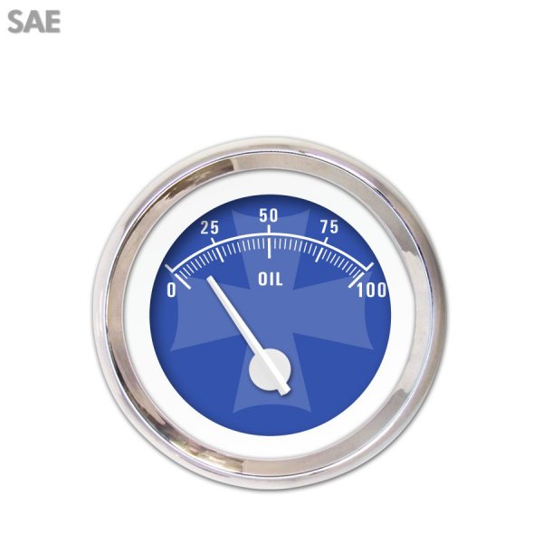 Oil Pressure Gauge - SAE Iron Cross Blue , White Modern Needles, Chrome Trim Rings ~ Style Kit DIY Install