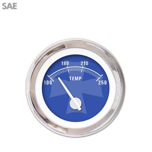 Water Temp Gauge - SAE Iron Cross Blue , White Modern Needles, Chrome Trim Rings ~ Style Kit DIY Install