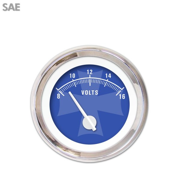Volt Gauge - SAE Iron Cross Blue , White Modern Needles, Chrome Trim Rings ~ Style Kit DIY Install