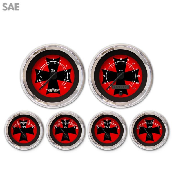 6 Gauge Set with emblem - SAE Iron Cross Red , Black Modern Needles, Chrome Trim Rings ~ Style Kit DIY Install