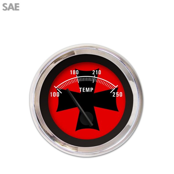 Water Temp Gauge - SAE Iron Cross Red , Black Modern Needles, Chrome Trim Rings ~ Style Kit DIY Install