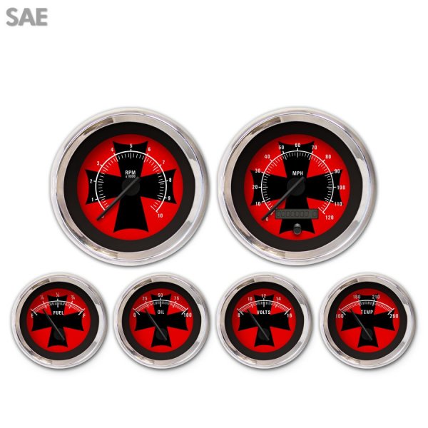 6 Gauge Set - SAE Iron Cross Red , Black Modern Needles, Chrome Trim Rings ~ Style Kit DIY Install