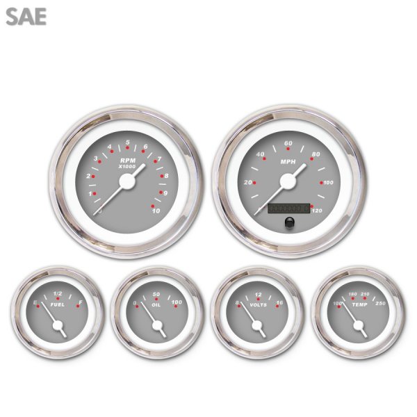 6 Gauge Set - SAE Modern Rodder Grey , White Vintage Needles, Chrome Trim Rings ~ Style Kit DIY Install