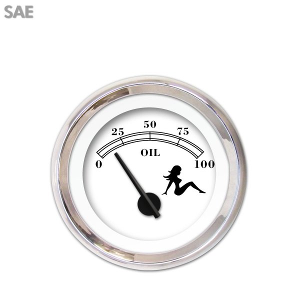 Oil Pressure Gauge - SAE Mudflap Black Text, White, Black Modern Needles, Chrome Trim Rings ~ Style Kit DIY Install