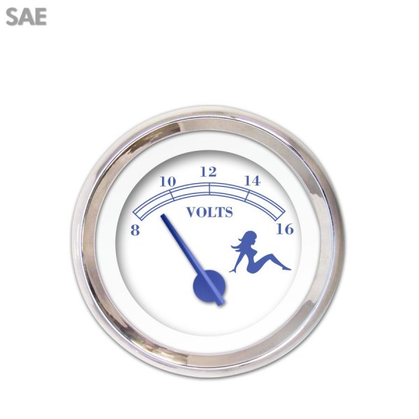 Volt Gauge - SAE Mudflap Blue Text, White, Blue Modern Needles, Chrome Trim Rings ~ Style Kit DIY Install