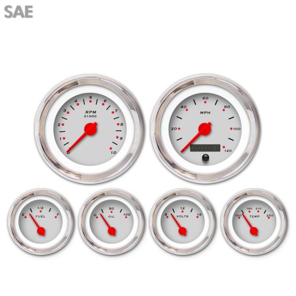 6 Gauge Set - SAE Pegged Ash , Red Modern Needles, Chrome Trim Rings ~ Style Kit DIY Install