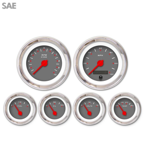 6 Gauge Set - SAE Pegged Dark Gray , Red Modern Needles, Chrome Trim Rings ~ Style Kit DIY Install