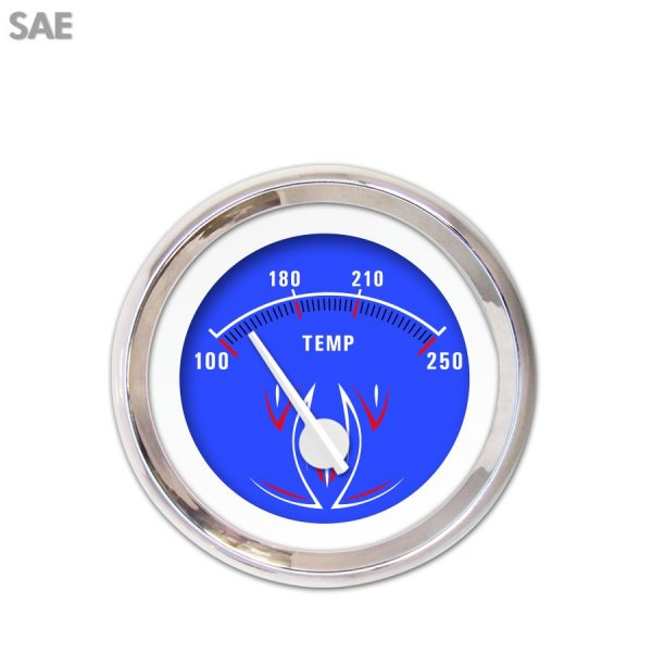 Water Temp Gauge - SAE Pinstripe II Blue , White Modern Needles, Chrome Trim Rings ~ Style Kit DIY Install