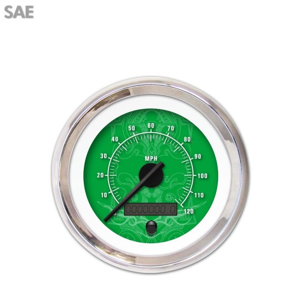 Product :: Speedometer Style :: Tribal Series ~ Green Unit Of Measure :: Imperial Trim Ring Series :: Modern Trim Ring Color :: Chrome Needle Series :: Modern Needle Color :: Black Emblem :: None | Assembly :: Gauge with Face Uninstalled Speedometer Range :: 0 - 120 mph Interchangeable Faces :: Yes Interchangeable Needles :: Yes Interchangeable Trim Ring :: Yes Gauge ID :: 2.25'' (56.8mm) Gauge OD :: 3.37'' (85.7mm) Odometer :: Included | Odometer Units :: Imperial & Metric Speedo Sensor :: GM Motor Style :: Stepper Motor Accuracy :: Industry Leading Accuracy Designed Location :: USA Support :: Toll Free Tech Support |