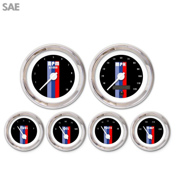 6 Gauge Set - SAE Vintage Autobahn Black , White Modern Needles, Chrome Trim Rings ~ Style Kit DIY Install