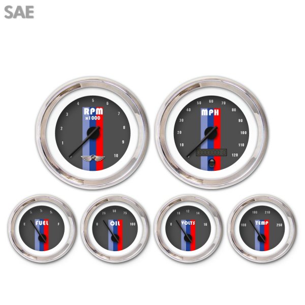 Product :: 6 Gauge Set Style :: Vintage Autobahn Series ~ Dark Gray Unit Of Measure :: Imperial Speedometer Gauge :: Included Tachometer Gauge :: Included Fuel Level Gauge :: Included Oil Pressure Gauge :: Included Volt Gauge :: Included Water Temp Gauge :: Included Trim Ring Series :: Modern Trim Ring Color :: Chrome Needle Series :: Modern Needle Color :: Black Emblem :: Wing | Assembly :: Gauge with Face Uninstalled Speedometer Range :: 0 - 120 mph Tachometer Range :: 0 - 10,000 rpm Fuel Level Range :: Empty - Full Oil Pressure Range :: 0 - 100 psi Volt Range :: 8 - 16 volt Water Temp Range :: 100 - 250 f Interchangeable Faces :: Yes Interchangeable Needles :: Yes Interchangeable Trim Ring :: Yes Number of Gauges :: 6 Number of Large Gauges :: 2 Number of Small Gauges :: 4 Large Gauge ID :: 2.25'' (56.8mm) | Small Gauge ID :: 1.8'' (47mm) Large Gauge OD :: 3.37'' (85.7mm) Small Gauge OD :: 2.06'' (56.4mm) Speedo Sensor :: GM Fuel Sensor :: Included Programable Fuel Sensor :: Yes Pressure Sensor :: Included Temp Sensor :: Included Tachometer Cylinders :: Adjustable ~ Up to 12 Motor Style :: Stepper Motor Accuracy :: Industry Leading Accuracy Designed Location :: USA Support :: Toll Free Tech Support |