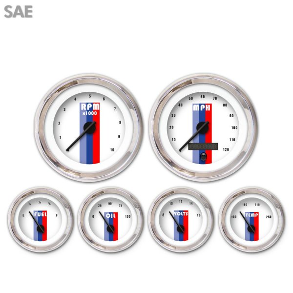Product :: 6 Gauge Set Style :: Vintage Autobahn Series ~ White Unit Of Measure :: Imperial Speedometer Gauge :: Included Tachometer Gauge :: Included Fuel Level Gauge :: Included Oil Pressure Gauge :: Included Volt Gauge :: Included Water Temp Gauge :: Included Trim Ring Series :: Modern Trim Ring Color :: Chrome Needle Series :: Modern Needle Color :: Black Emblem :: None | Assembly :: Gauge with Face Uninstalled Speedometer Range :: 0 - 120 mph Tachometer Range :: 0 - 10,000 rpm Fuel Level Range :: Empty - Full Oil Pressure Range :: 0 - 100 psi Volt Range :: 8 - 16 volt Water Temp Range :: 100 - 250 f Interchangeable Faces :: Yes Interchangeable Needles :: Yes Interchangeable Trim Ring :: Yes Number of Gauges :: 6 Number of Large Gauges :: 2 Number of Small Gauges :: 4 Large Gauge ID :: 2.25'' (56.8mm) | Small Gauge ID :: 1.8'' (47mm) Large Gauge OD :: 3.37'' (85.7mm) Small Gauge OD :: 2.06'' (56.4mm) Speedo Sensor :: GM Fuel Sensor :: Included Programable Fuel Sensor :: Yes Pressure Sensor :: Included Temp Sensor :: Included Tachometer Cylinders :: Adjustable ~ Up to 12 Motor Style :: Stepper Motor Accuracy :: Industry Leading Accuracy Designed Location :: USA Support :: Toll Free Tech Support |